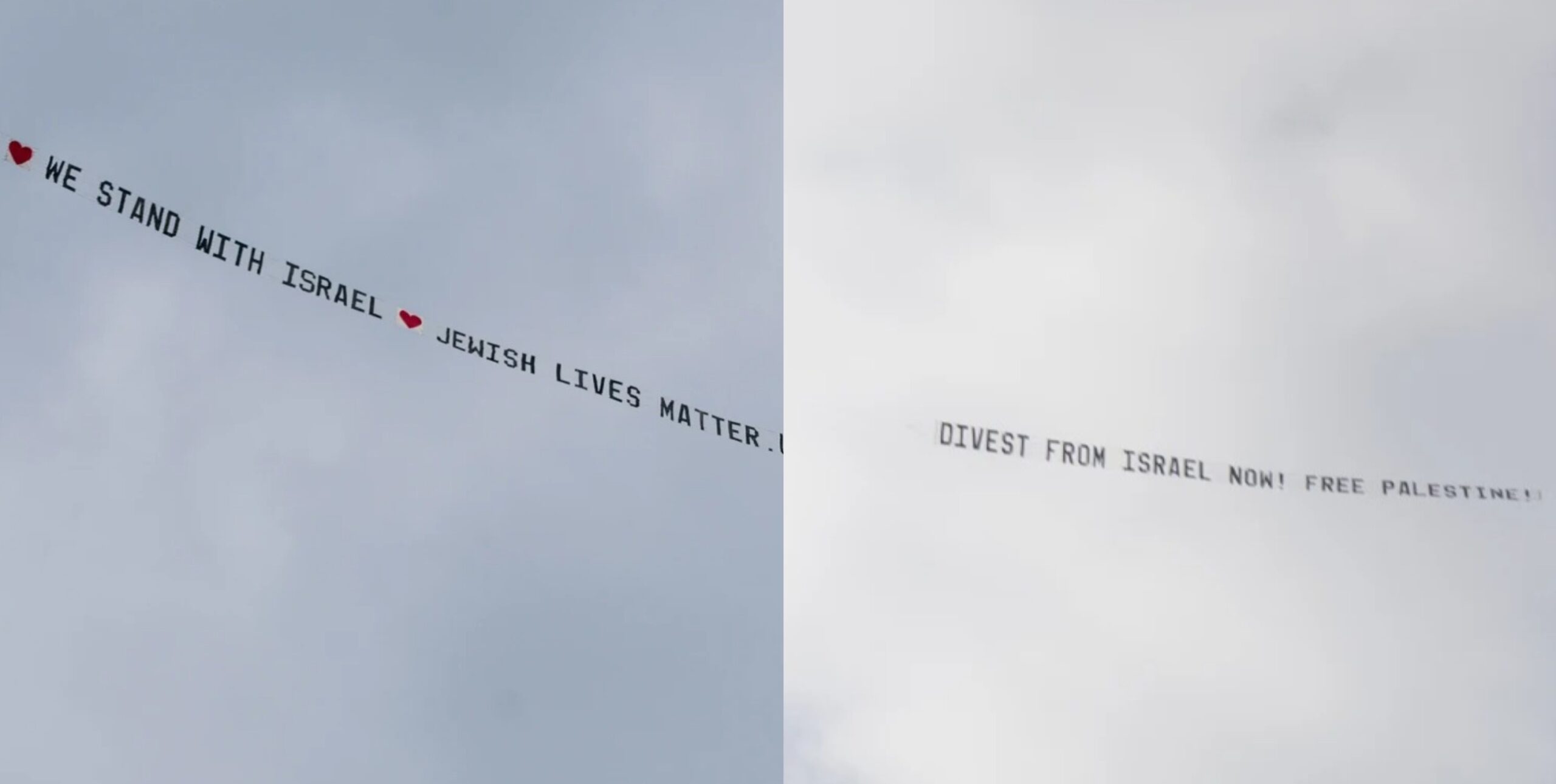 Overhead, planes flew banners with competing messages. “Divest from Israel now! Free Palestine!” and “We stand with Israel. Jewish lives matter.”