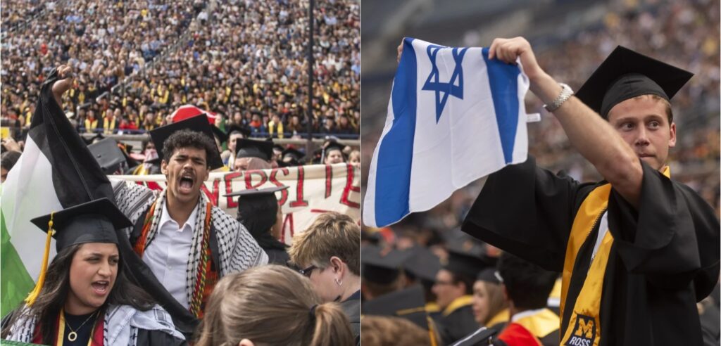 In Ann Arbor, the protest happened at the beginning of the event at Michigan Stadium. About 75 people, many wearing traditional Arabic kaffiyehs along with their graduation caps, marched up the main aisle toward the graduation stage.