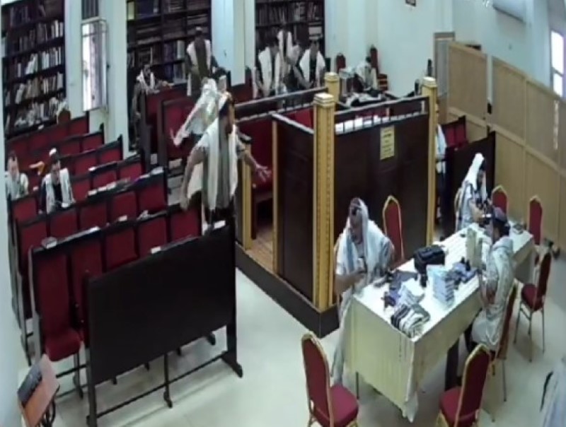 The video below shows security camera footage from a Chabad house in the city where mispallelim were davening Shacharis when the siren blared.
