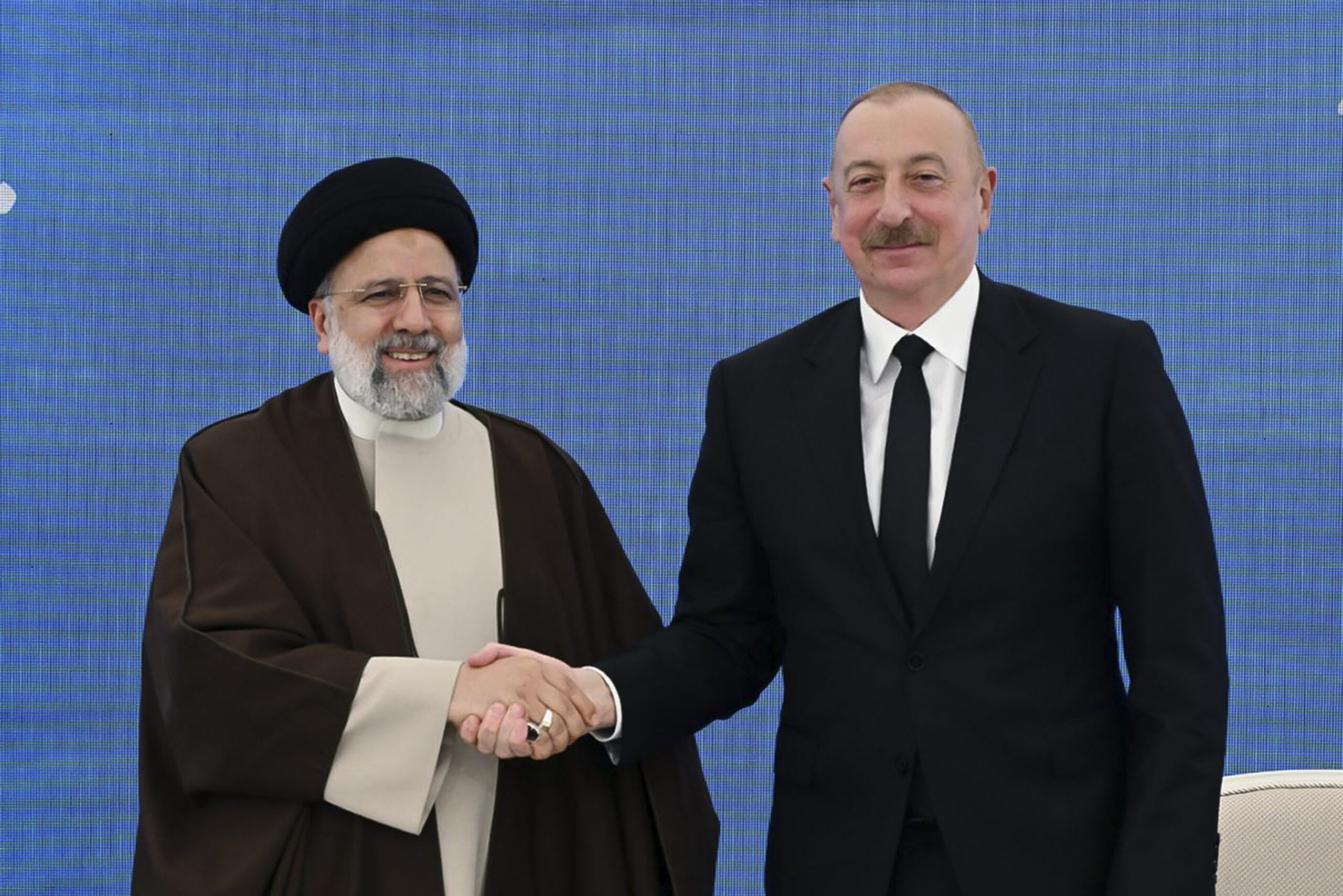 In this photo released by the Iranian Presidency Office, President Ebrahim Raisi attends a meeting with his Azeri counterpart Ilham Aliyev during the inauguration ceremony of dam of Qiz Qalasi, or Castel of Girl in Azeri, at the border of Iran and Azerbaijan, Sunday, May 19, 2024. (Iranian Presidency Office via AP)