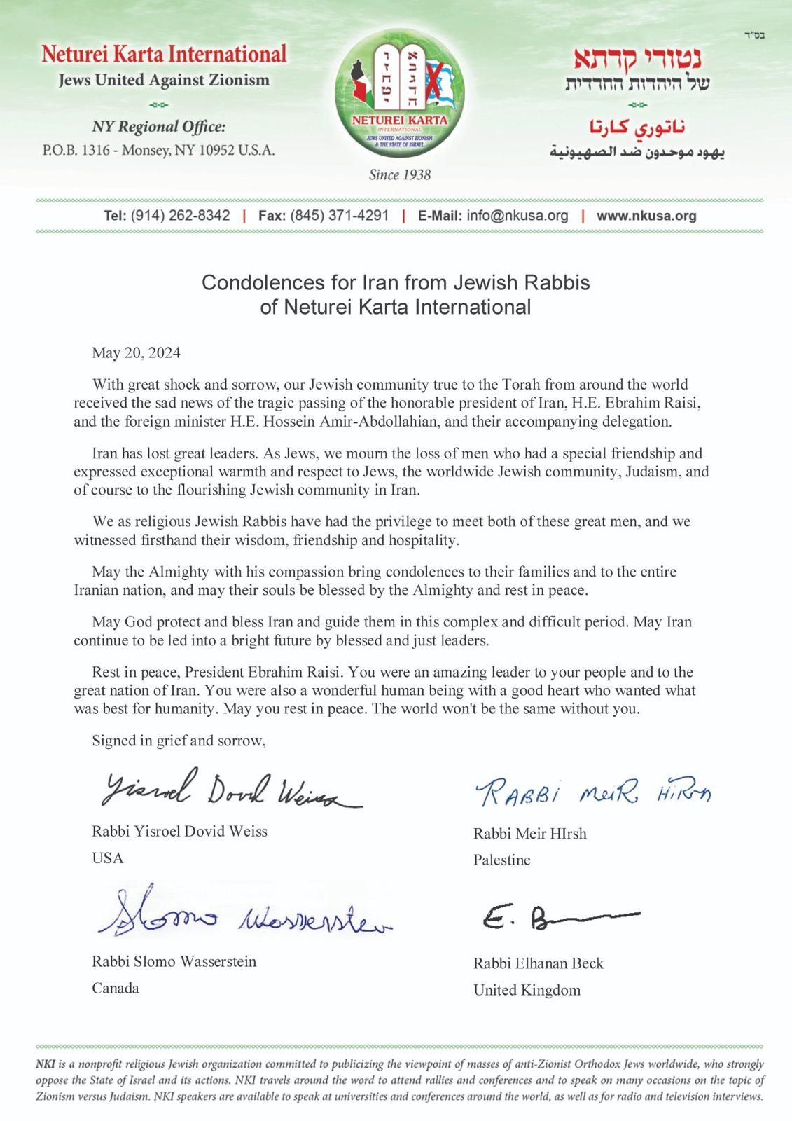 Following the death of Raisi, YWN published the Neturei Karta statement which praised this arch terrorist. “As Jews, we mourn the loss of men who had a special friendship and expressed exceptional warmth and respect to Jews, the worldwide Jewish community,” the statement read.