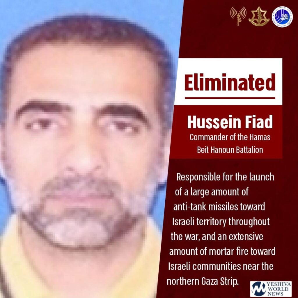 IDF and Israel Security Agency (ISA) special forces successfully eliminated Hussein Fiad, the Commander of Hamas’ Beit Hanoun Battalion, in an underground area in Jabaliya. Fiad was a high-ranking terrorist responsible for launching numerous anti-tank missiles and mortar attacks on Israeli territory and communities near the northern Gaza Strip.