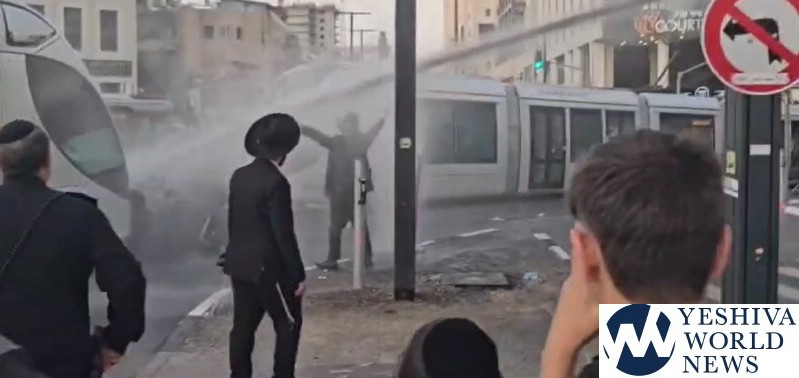 A small group of Charedi protesters blocked the intersection of Sarei Yisrael and Yaffa streets in Jerusalem on Thursday evening, demonstrating against the proposed law on the conscription of yeshiva bochurim. Police used force, including horses and water cannons, to disperse the protestors.