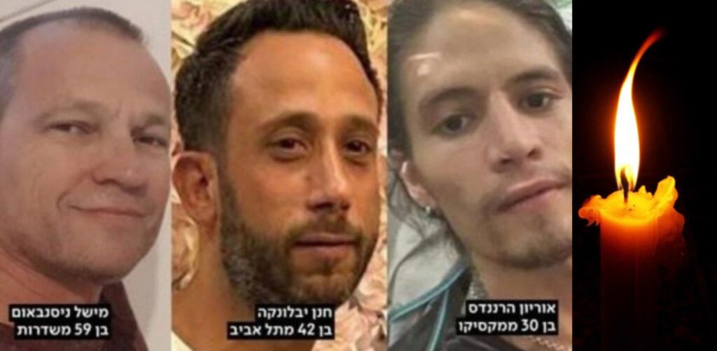 The hostages, Chanan Yavlonka, H’yd, 43, Michel Nisenbaum, H’yd 59, and Orión Hernández Radoux, 30, were thought to be alive until recently, when reliable IDF intelligence revealed that they were murdered at the Mefalsim intersection on October 7th and their bodies were taken hostage into Gaza.