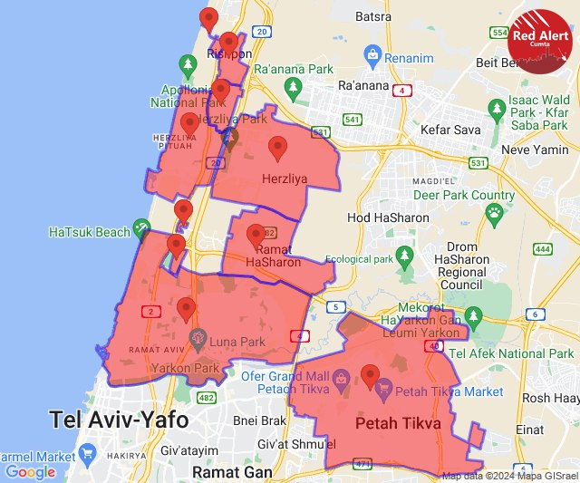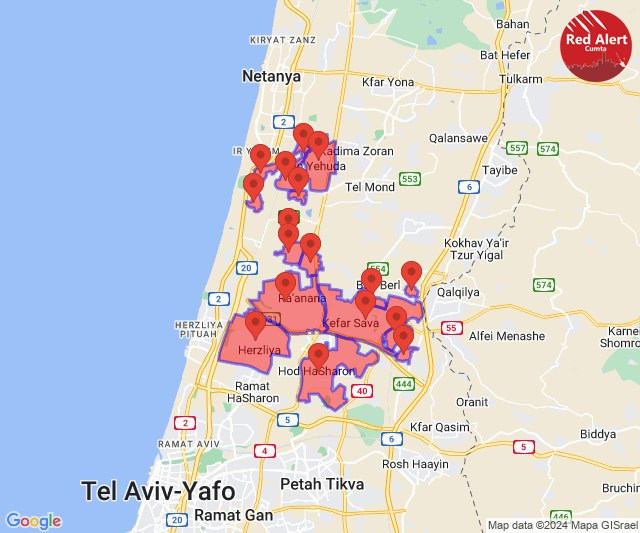 Sirens blared in Tel Aviv, Ra’anana, Herzliya, Kfar Saba, Hod HaSharon, Petach Tikvah, and other nearby areas. Residents reported hearing the sound of booms.