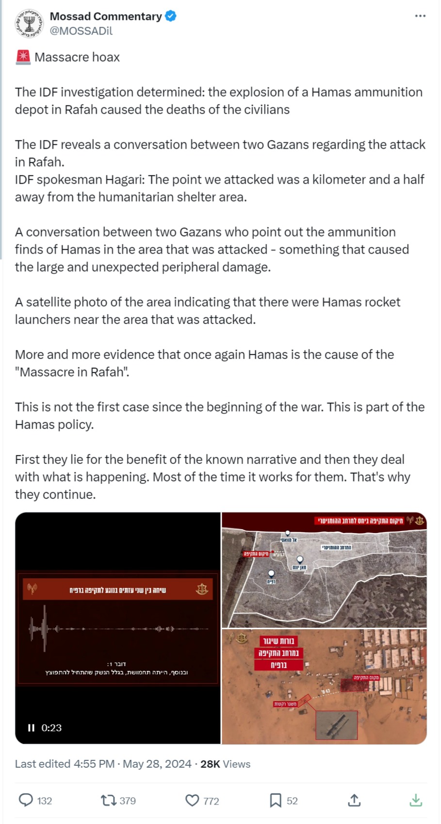IDF spokesperson Daniel Hagari said on Tuesday that the massive fire that broke out at a tent camp in Rafah was most likely the result of a large amount of ammunition in a Hamas building where two commanders were killed by an IDF airstrike on Sunday.