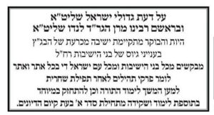 A special call from HaRav Landau was published, stating: “Since this morning there is a decisive meeting of the Supreme Court regarding the recruitment of Bnei Yeshivos, rachmana litzlan, we ask all Bnei Yeshivos and all of Am Yisrael in every location to recite pirkei Tehillim after Shacharis for the continuation of limmud Torah and to be mechazeik, especially in intensifying limmud HaTorah and diligence from the beginning of Seder Aleph while the hearing is taking place.”