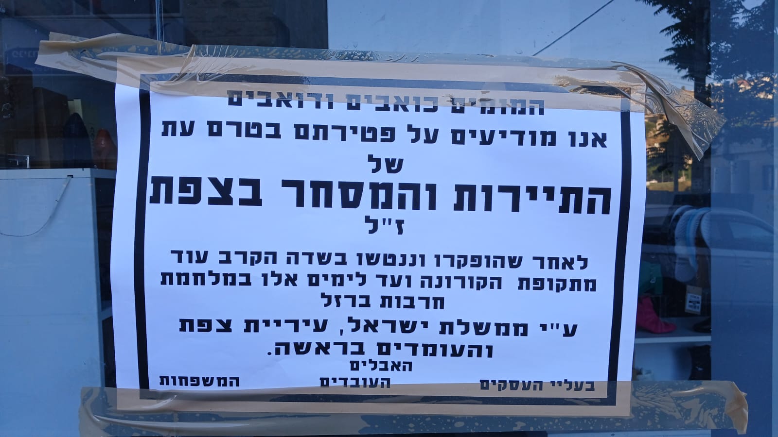 A “mourning” notice in Tzfas bemoaning the death of the tourism and business industries in the city in the wake of the war and previously the COVID pandemic.