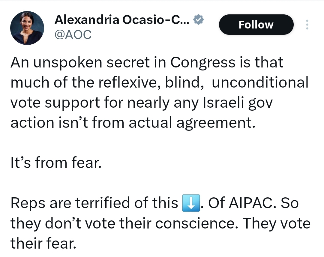 The exchange began when Ocasio-Cortez posted, “An unspoken secret in Congress is that much of the reflexive, blind, unconditional vote support for nearly any Israeli gov action isn’t from actual agreement. It’s from fear. Reps are terrified of this. Of AIPAC. So they don’t vote their conscience. They vote their fear.”