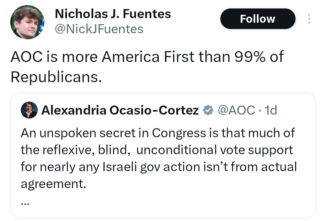 Fuentes, who has denied the Holocaust and called for the execution of non-Christians, responded, “AOC is more America First than 99% of Republicans.”