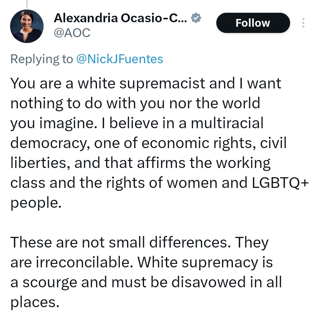 Ocasio-Cortez replied, “You are a white supremacist and I want nothing to do with you nor the world you imagine. I believe in a multiracial democracy, one of economic rights, civil liberties, and that affirms the working class and the rights of women and LGBTQ+ people.”