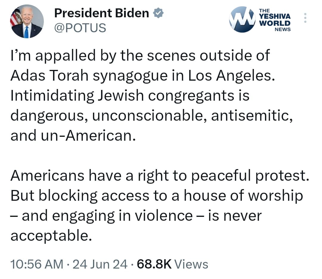 Newsom called the incident “antisemitic hatred” and said it has “no place in California.” Bass labeled the violence “abhorrent” and “unacceptable,” adding that “Los Angeles will not be a harbor for antisemitism and violence.” President Biden also condemned the protest tactics, saying “Intimidating Jewish congregants is dangerous, unconscionable, antisemitic, and un-American.”