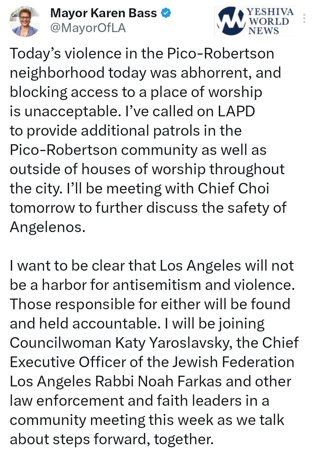 Mayor Bass has also ordered increased police patrols in the area and at houses of worship around the city and will meet with officials and faith leaders to discuss security measures and related issues.