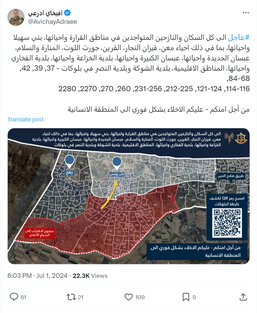 The IDF’s Arabic spokesperson published the announcement on social media, including a map of the zones that must be evacuated.