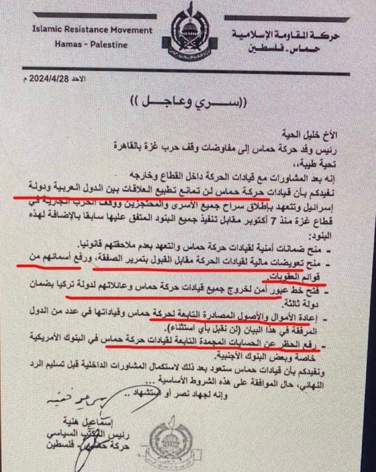 Leaked documents from negotiations with Hamas reveal the terrorist group’s demands: monetary compensation, security guarantees for their leaders, safe passage to Turkey, the return of confiscated funds, and the lifting of bans on their foreign bank accounts. The suffering of Gaza’s residents, a result of Hamas’ actions, is notably absent from their concerns.