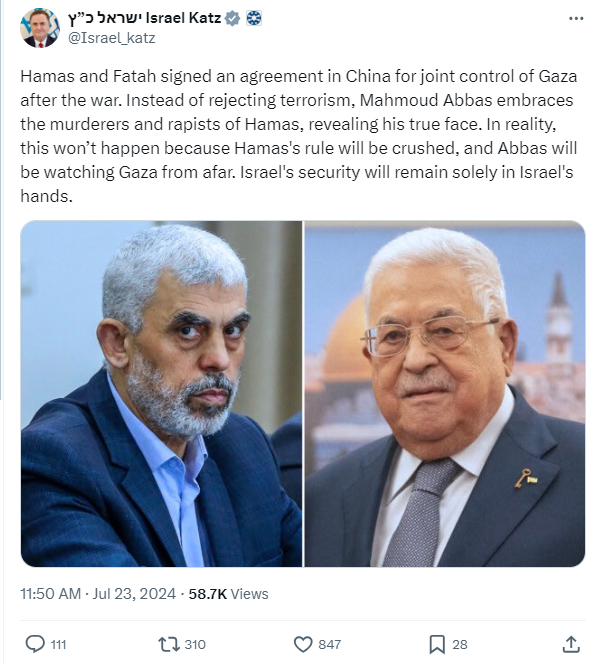 Israel’s Foreign Minister Yisrael Katz responded to the report by stating: “Hamas and Fatah signed an agreement in China for joint control of Gaza after the war. Instead of rejecting terrorism, Mahmud Abbas embraces the murderers and rapists of Hamas, revealing his true face.”