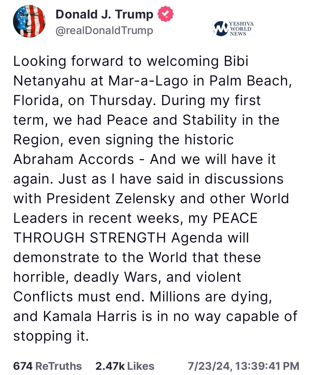 Former President Donald Trump announced via his Truth Social network that he will meet with Prime Minister Benjamin Netanyahu on Friday at the Mar-a-Lago resort in Palm Beach, Florida.