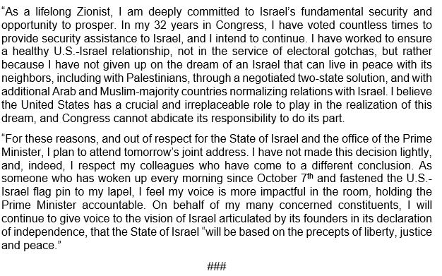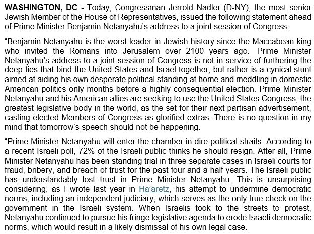 “The Prime Minister is putting the security of Israel, the lives of the hostages, the stability of the region, and longstanding Israeli democratic norms in perilous jeopardy, simply to maintain the stability of his far-right coalition and absolve him of his own legal troubles,” Nadler wrote on X. “Tomorrow’s address is the next step in a long line of manipulative bad-faith efforts by Republicans to further politicize the U.S.-Israel relationship for partisan gain and is a cynical stunt by Netanyahu aimed at aiding his own desperate political standing at home. There is no question in my mind it should not be happening. Still, I have not given up on the dream of an Israel that can live in peace with its neighbors, including with Palestinians, through a negotiated two-state solution.”