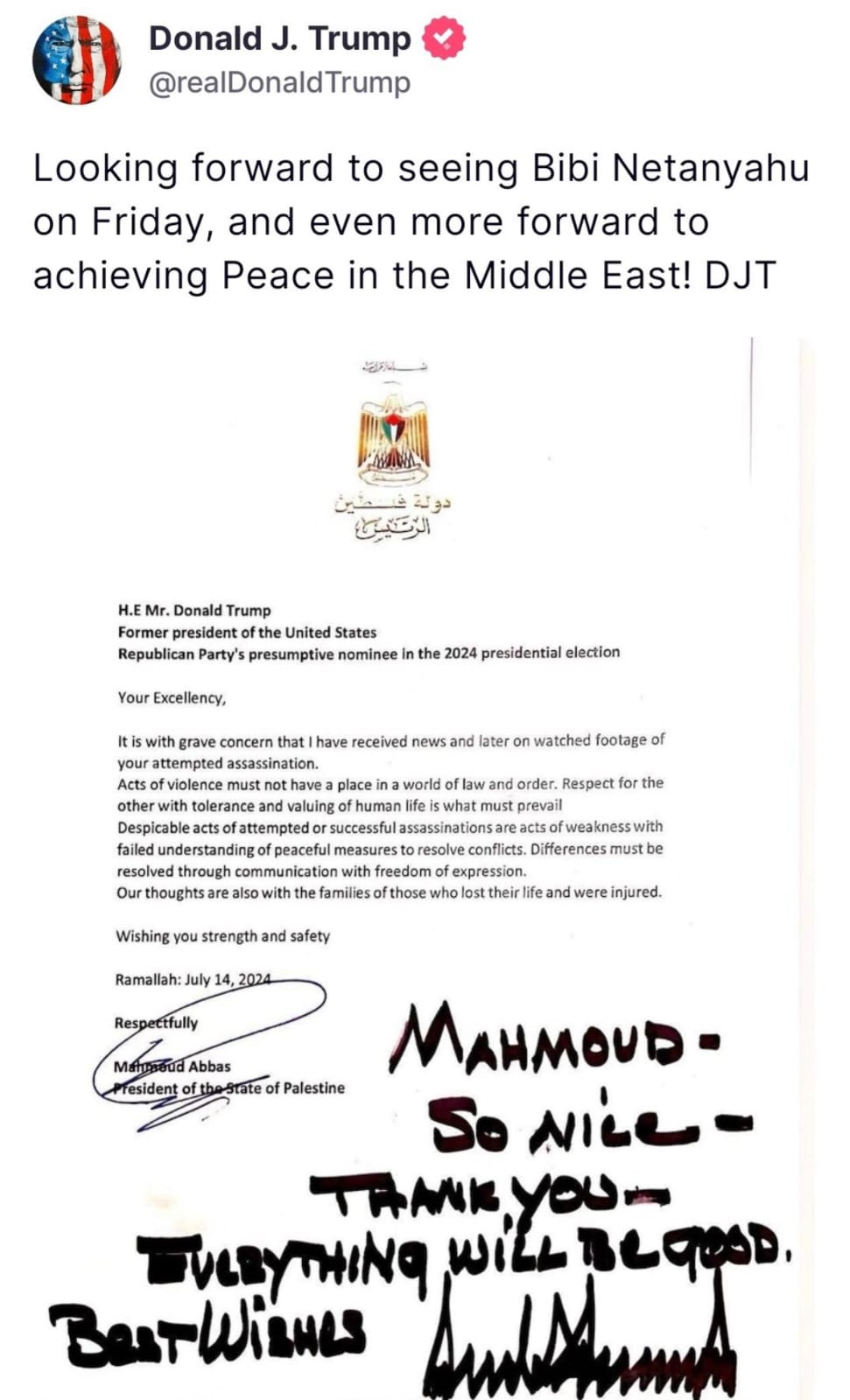 Trump shared the message on his social media platform, Truth Social, on Tuesday. He posted a letter from Abbas dated July 14, which expressed concern over a failed assassination attempt on Trump in Philadelphia on July 13. In response, Trump wrote, “Mahmoud, so nice. Thank You. Everything will be Good.”