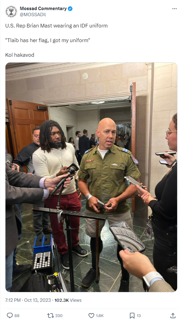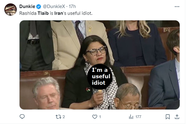 Many social media users commented on how the sign reflected on her, with author Aviva Klompas writing: “Talib holding up her own name tag.” Dr. Eli David stated: “Breaking: Rashida Tlaib just announced who she is.”