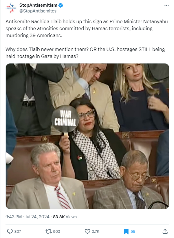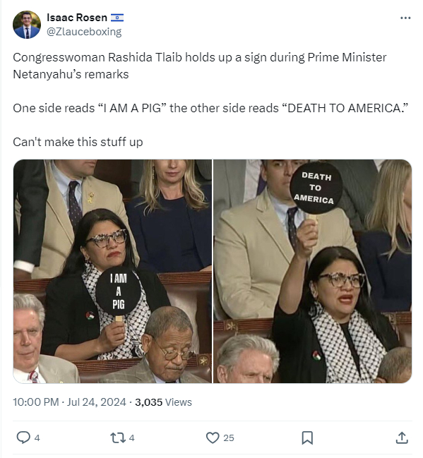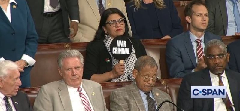Politicians, media personalities, and social media users excoriated Rep. Rashida Tlaib, D-Mich. who sat in the audience at Prime Minister Binyamin Netanyahu’s address to Congress on Wednesday wearing a keffiyeh and holding a sign stating “war criminal” on one side and “guilty of genocide” on the other side.