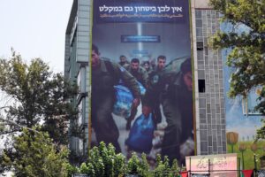 A new sign was hung in “Palestine Square” in Tehran with an Al-produced image of fleeing IDF soldiers with a message written in broken Hebrew: “You have no security even in the shelter.” The sign also bears a message in Farsi, stating: “Smile for a while because very soon you will cry.”