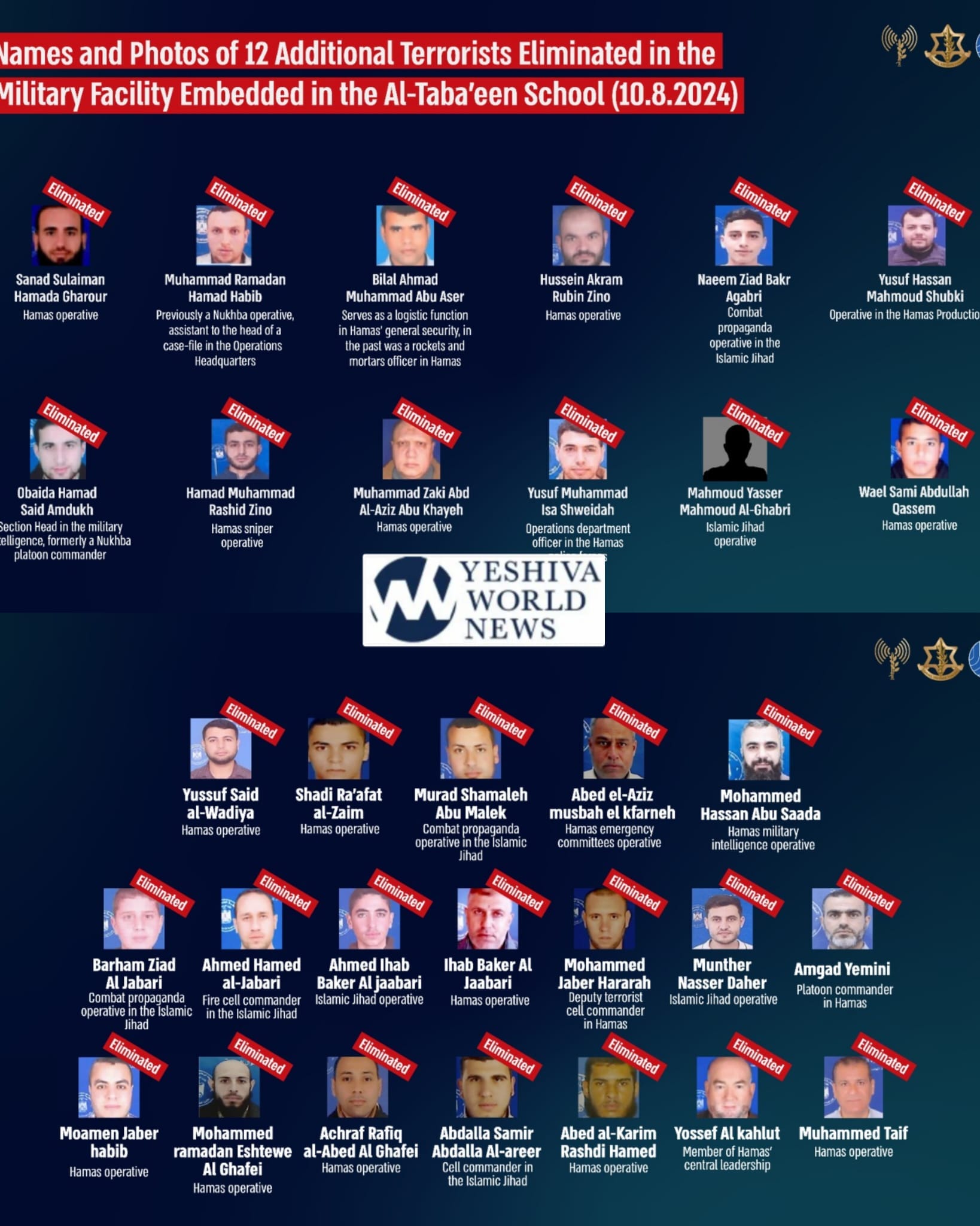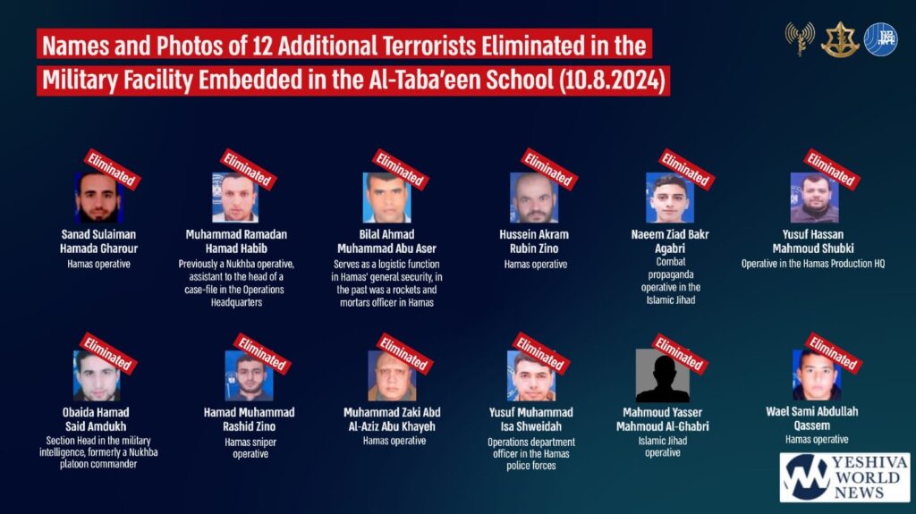 Initially, the IDF identified 19 operatives killed in the strike on a command center within a mosque at the al-Taba’een school complex. They have now released the names and photos of 12 more operatives killed in the attack.
