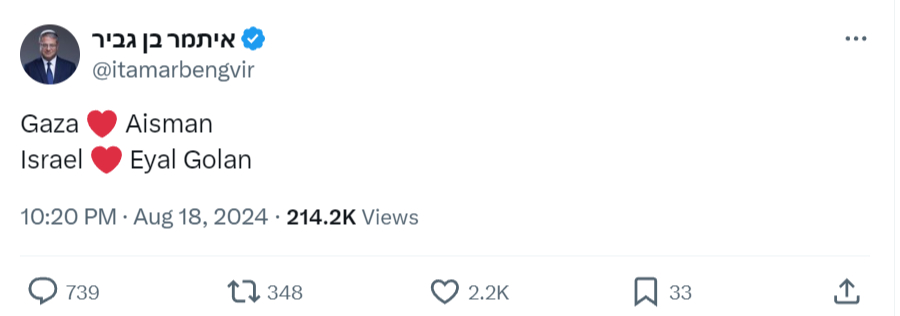 National Security Minister Itamar Ben-Gvir said: “Isman’s lunacy continues. Instead of investing in Israel’s war efforts, Isman invests in Sinwar’s war efforts. I call on the Justice Minister and the Prime Minister to bring a resolution to the next Cabinet meeting to immediately remove him from office.”