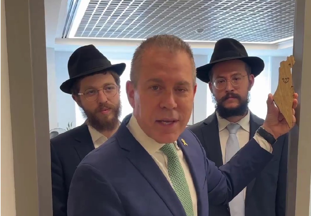 On Monday, Erdan published a video showing the fulfillment of his promise to the head of the Shomron Regional Council that he would put up a mezuzah in the shape of the entire Eretz Yisrael on the doorpost of the new UN ambassador’s office.
