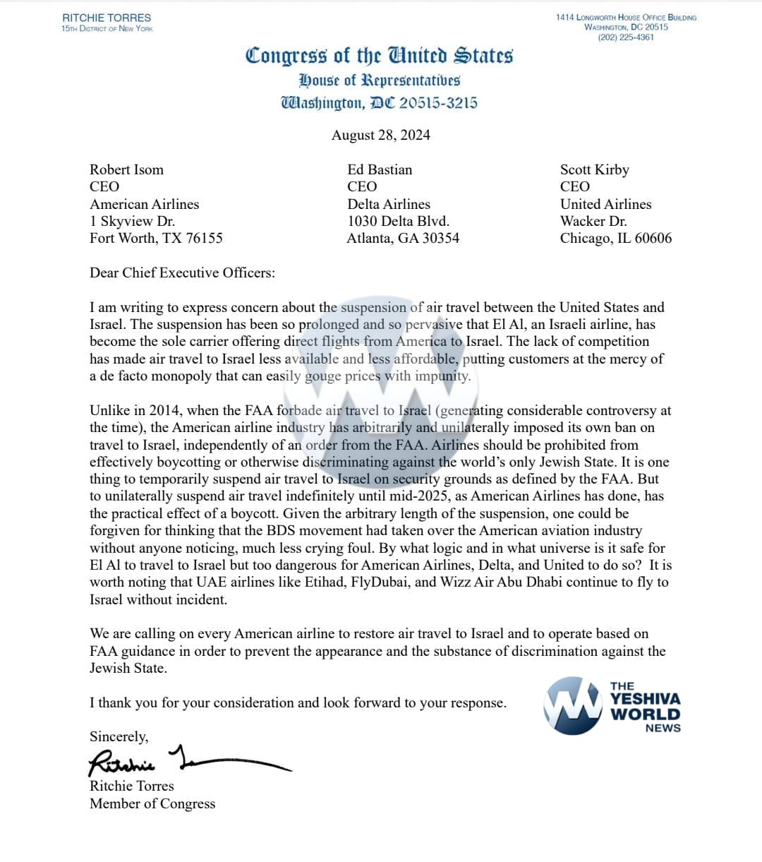 In a letter addressed to the CEOs of the airlines and obtained by YWN, Torres expressed concern that the ongoing suspension has made air travel to Israel increasingly difficult and expensive. “The lack of competition has made air travel to Israel less available and less affordable, putting customers at the mercy of a de facto monopoly that can easily gouge prices with impunity,” Torres wrote to American Airlines CEO Robert Isom, Delta CEO Ed Bastian, and United CEO Scott Kirby.