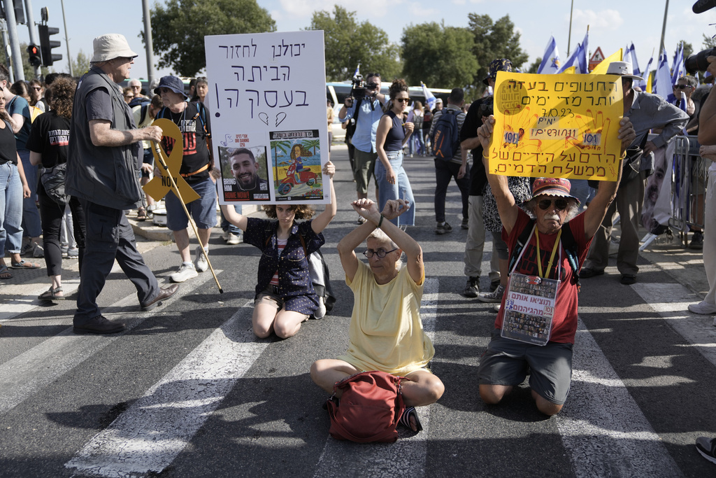 Thousands of people gathered Sunday night outside Netanyahu’s office in Jerusalem. In Tel Aviv, hostages’ relatives marched with coffins to symbolize the toll.