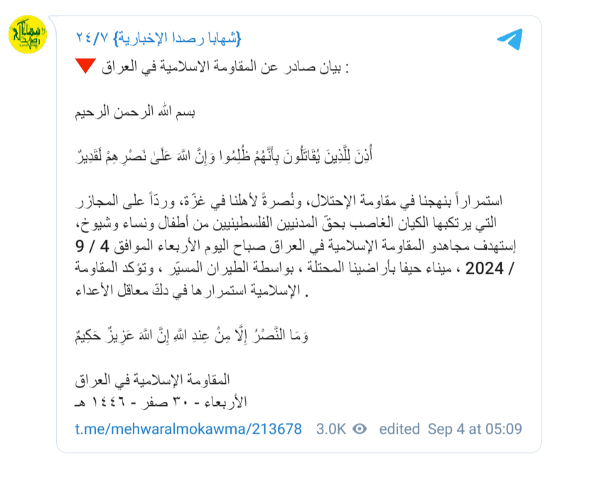 The Islamic Resistance terror group in Iraq claimed responsiblity for the launch and said it was directed at the port of Haifa.
