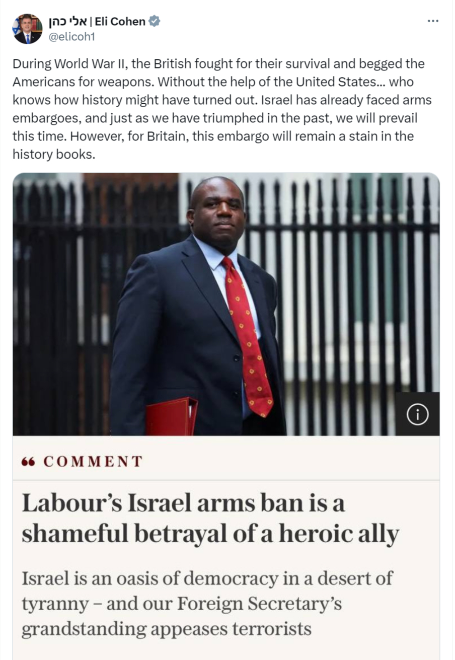 Energy Minister Eli Cohen (Likud) tweeted Pearson’s article on Wednesday, commenting: “During World War II, the British fought for their survival and begged the Americans for weapons. Without the help of the United States… who knows how history might have turned out. Israel has already faced arms embargoes, and just as we have triumphed in the past, we will prevail this time. However, for Britain, this embargo will remain a stain in the history books.”