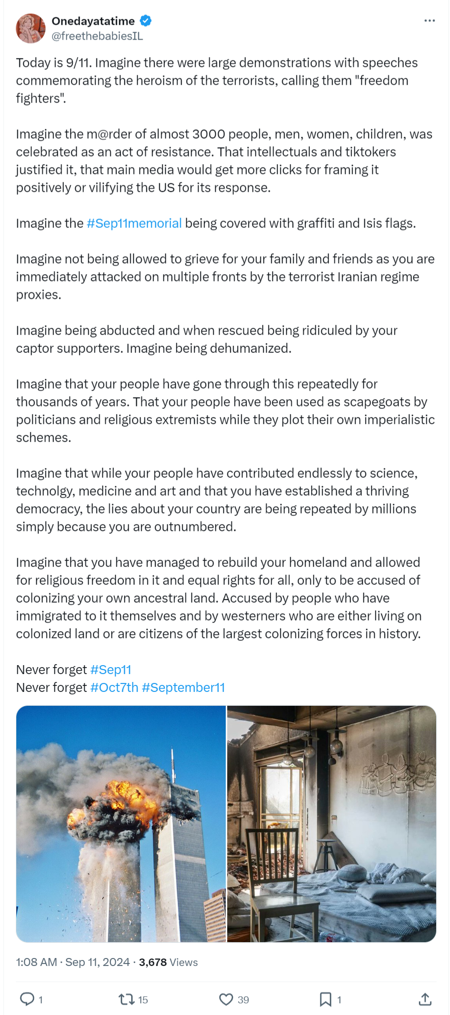 Twenty-three years ago, Palestinains celebrated on the street on September 11, rejoicing at the deaths of almost 3,000 Americans.