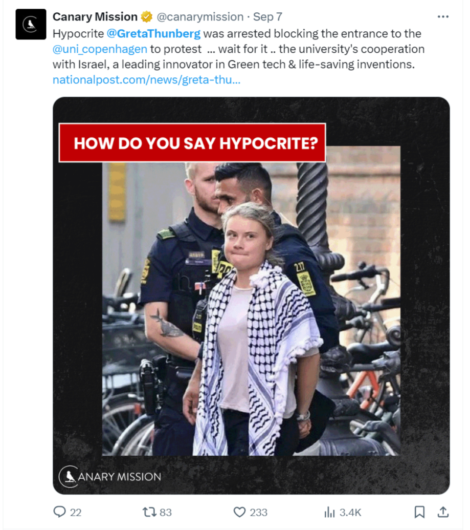Thunberg “has joined the ranks of keffiyeh-clad protesters, brazenly voicing her disdain for the Jewish state,” StopAntisemitism stated on Friday. “She has sadly transformed her activism into a platform for vile Jew-hatred.”