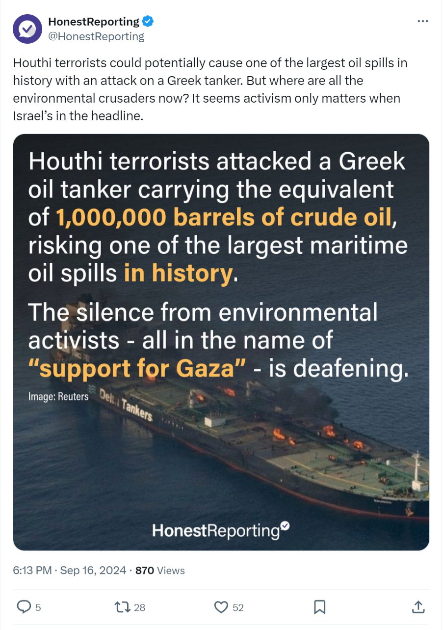 Meanwhile, despite her supposed devotion to environmental issues, Israel is still waiting for her to call out Hezbollah for setting thousands and thousands of acres of forestland on fire and the Houthis for attacking a tanker carrying a million barrels of crude oil, potentially causing the largest oil spill in history.