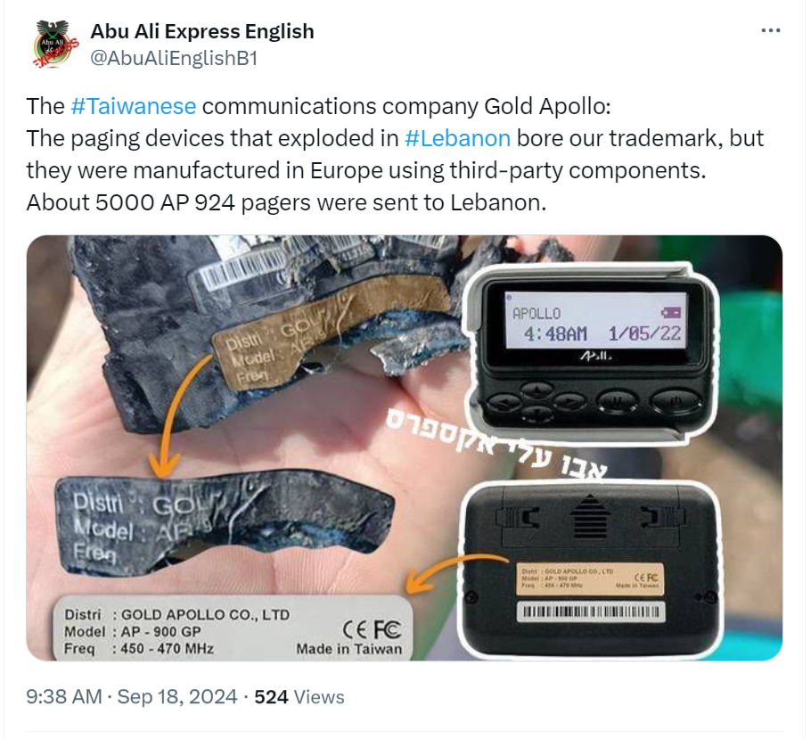 Taiwanese company Gold Apollo said Wednesday that it authorized its brand on the pagers that exploded in Lebanon and Syria but that another company based in Budapest manufactured them.