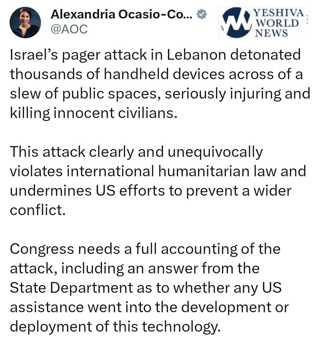 AOC has conveniently ignored Hezbollah’s indiscriminate firing of thousands of missiles and drones at northern Israeli communities, forcing the evacuation of tens of thousands of residents who are still displaced and living out of hotels. She has also completely ignored one specific missile attack which landed in the town of Majdal Shams, killing 12 Bedouin children. But when Israel blows up the devices of Hezbollah terrorists, she runs to condemn it as a “war crime.” Just in case you were wondering where her allegiances lie…