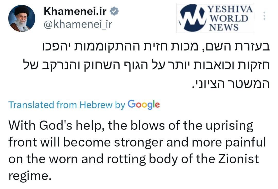 In another post, written in broken Hebrew, Khamenei warned that the “blows of the uprising front will become stronger and more painful on the worn and rotting body of the Zionist regime.”