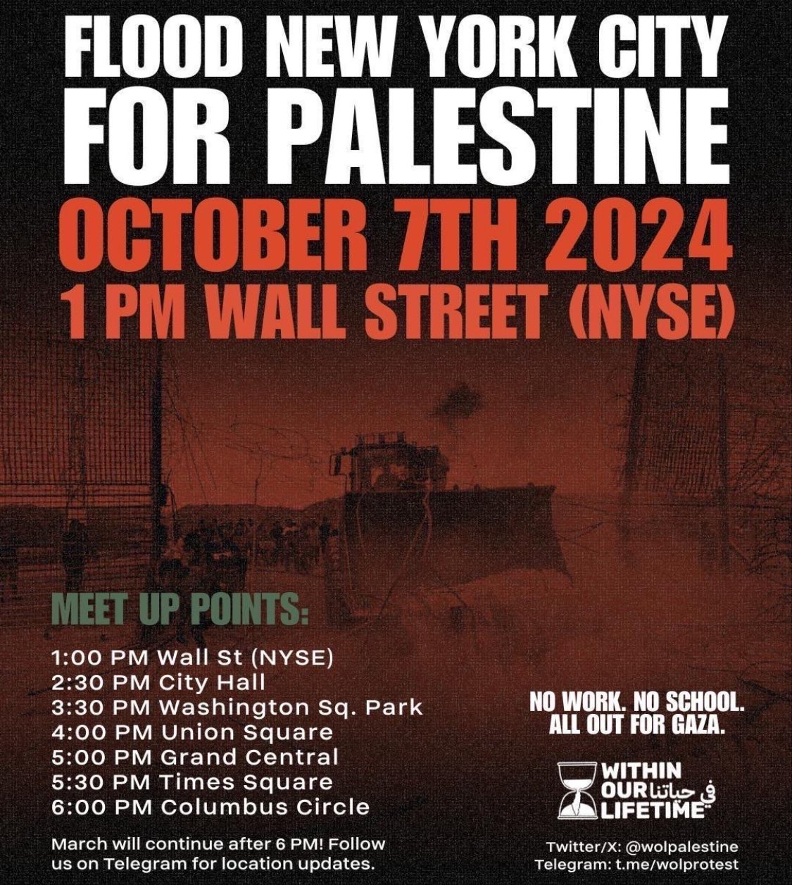 Good afternoon, I figured that I would reach out to the mayor’s office after reading about planned anti-Israel protests in NYC tomorrow. One post, which calls for mass gatherings at multiple places in the city, is titled “Flood NYC for Palestine” and includes a photo of a bulldozer breaching the Gaza wall. This title and picture are obvious and blatant references to Hamas’s Operation Al-Aqsa Flood, which resulted in the massacre of 1,200 Jews.