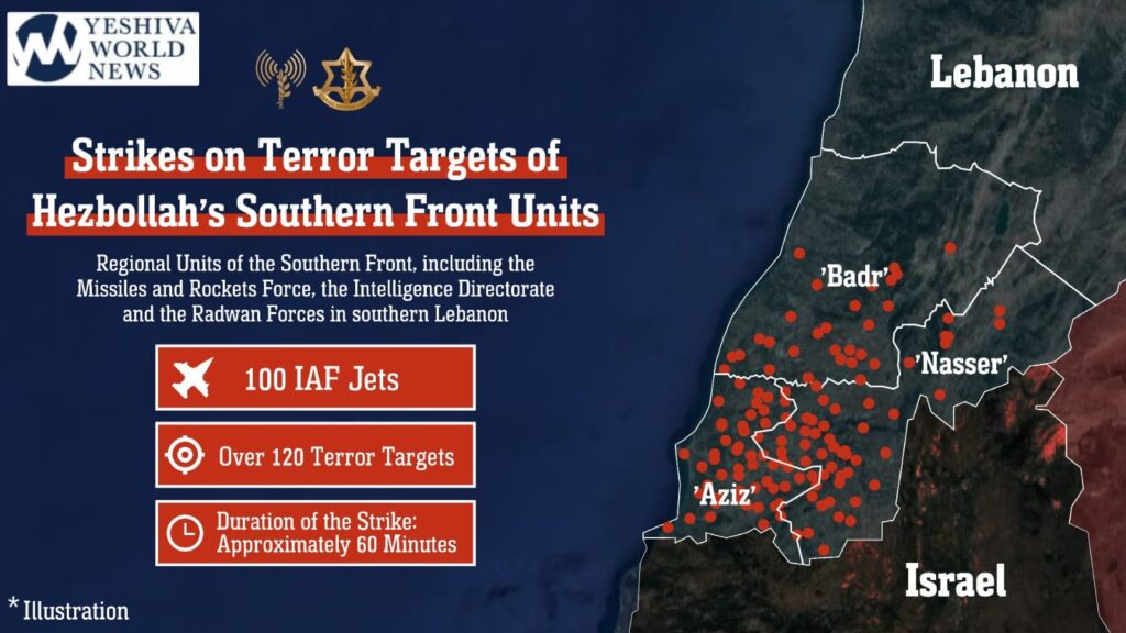 The Israeli Air Force (IAF) conducted a large-scale aerial operation on Monday, striking more than 120 Hezbollah terror targets in southern Lebanon within an hour. The operation, carried out with the involvement of over 100 fighter jets, was based on precise IDF intelligence and targeted various units within the Hezbollah terrorist organization.
