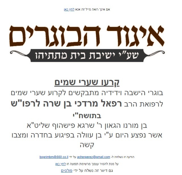 His Rosh Yeshivah, HaGaon HaRav Yehoshua Ehrenberg, has instructed kollelim and yeshivos to tear the gates of Shamayim and daven for his refuah.