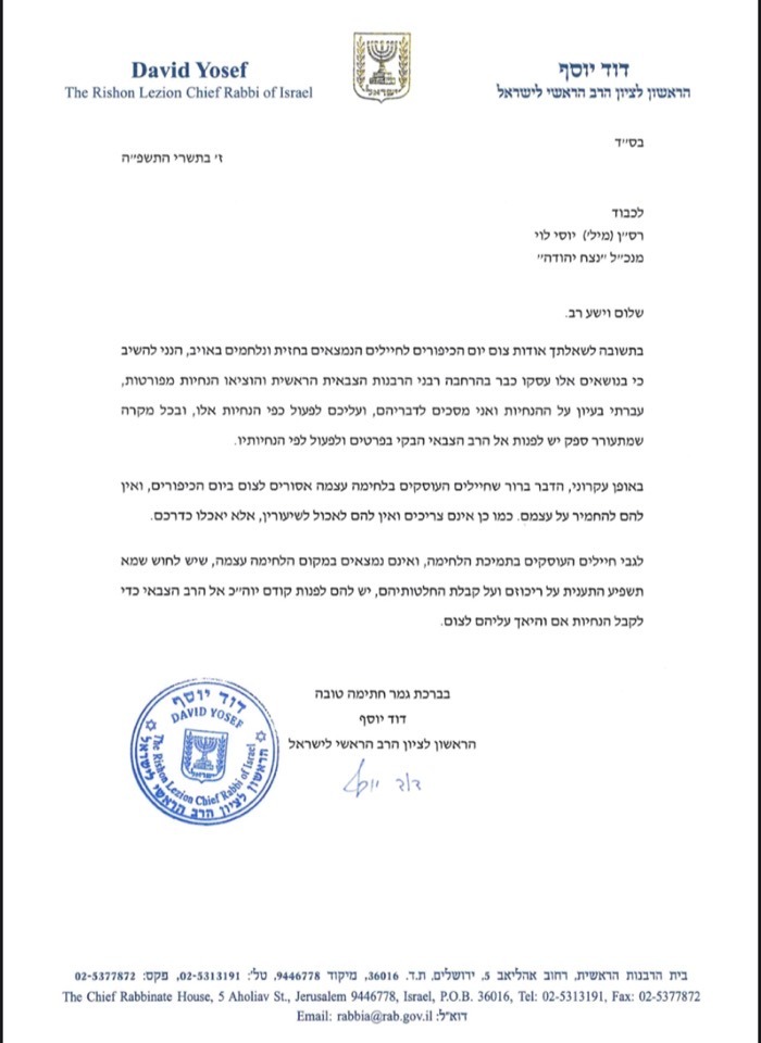 HaRav Yosef added: “Regarding soldiers involved in the war but not in active combat and there are concerns that the fast will influence their concentration and decision-making, they should approach their military Rav before Yom Kippur in order to to receive instructions if and how they should fast.”