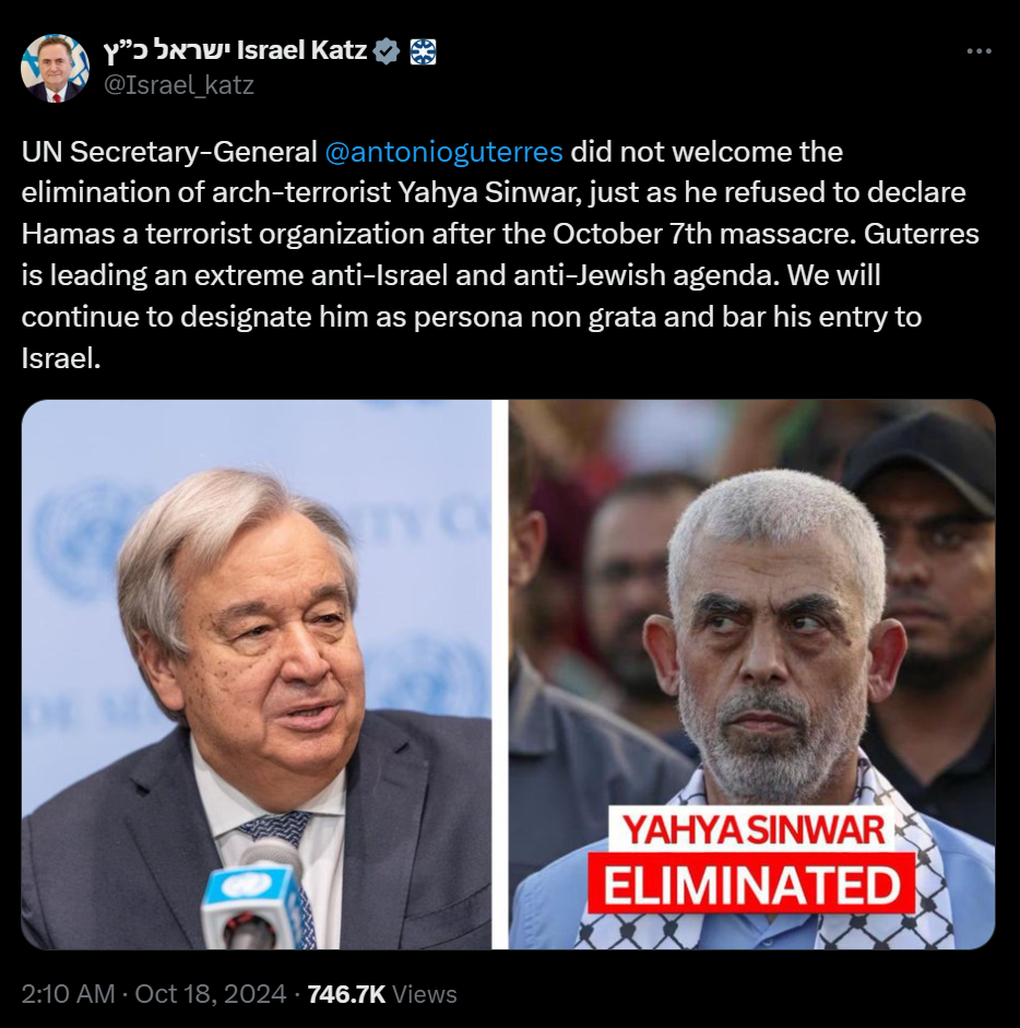 Israeli Foreign Minister Yisroel Katz condemned United Nations Secretary-General António Guterres on Friday for failing to acknowledge or praise Israel over its killing of Hamas terror leader Yahya Sinwar, and for failing to designate Hamas as a terrorist organization following its October 7 attack on Israel.