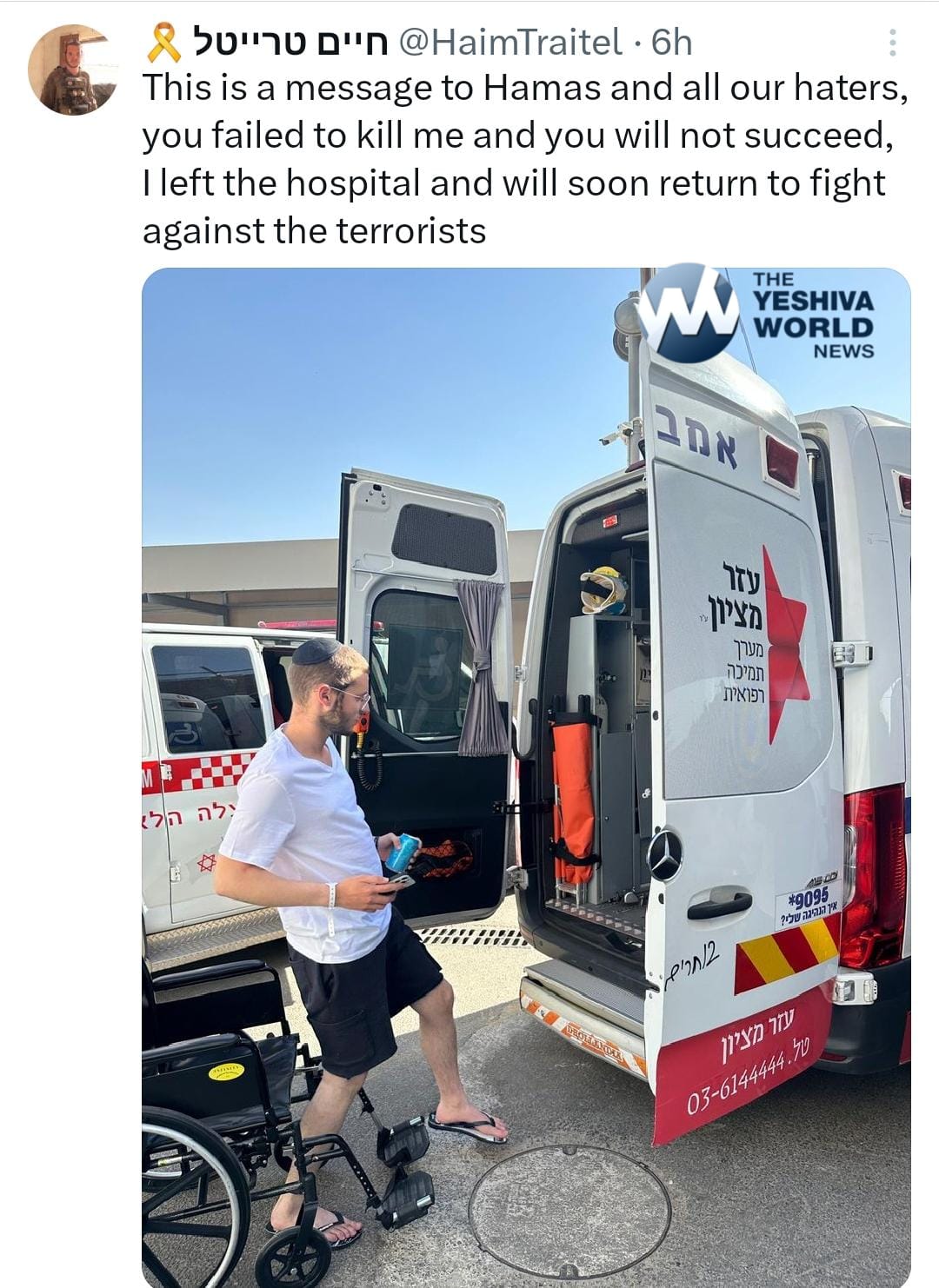 In a defiant message posted on social media, Treitel addressed Hamas directly, writing, “This is a message to Hamas and all our haters, you failed to kill me and you will not succeed. I left the hospital and will soon return to fight against the terrorists.”