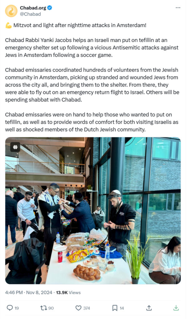 Chabad shlichim in Amsterdam also assisted the Israeli victims of the attacks along with Israeli and Jewish organizations, including the Maccabi World Union, which opened an emergency assistance center in Amsterdam and helped hundreds of victims, including providing or locating food, hotels, transportation, and security. The Jewish Agency is also assisting the victims and sent an agency representative to Amsterdam.