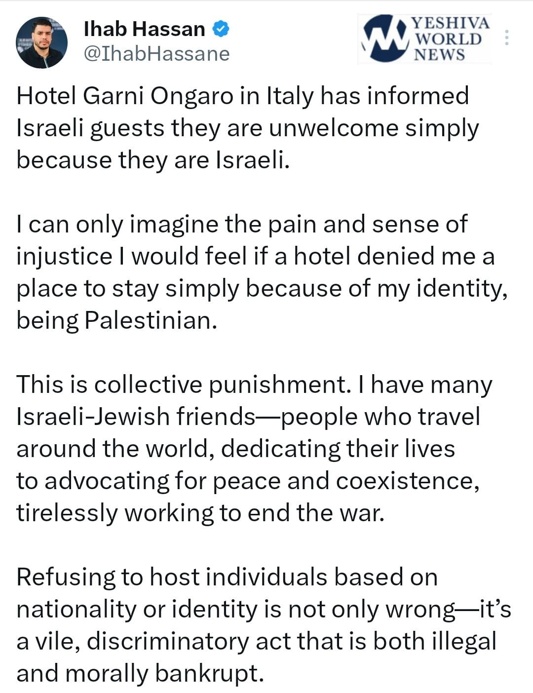 The manager of a small hotel in northern Italy refused a reservation made by an Israeli couple, accusing Israeli people of being “responsible for genocide.” Jewish groups decried the incident as an example of antisemitism.