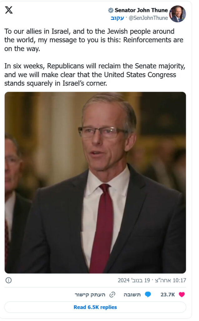 A video of US Senate Majority Leader-elect Senator John Thune (R-SD) promising Israel and Jews around the world that “reinforcements are on the way” was widely shared in Israel on Wednesday.