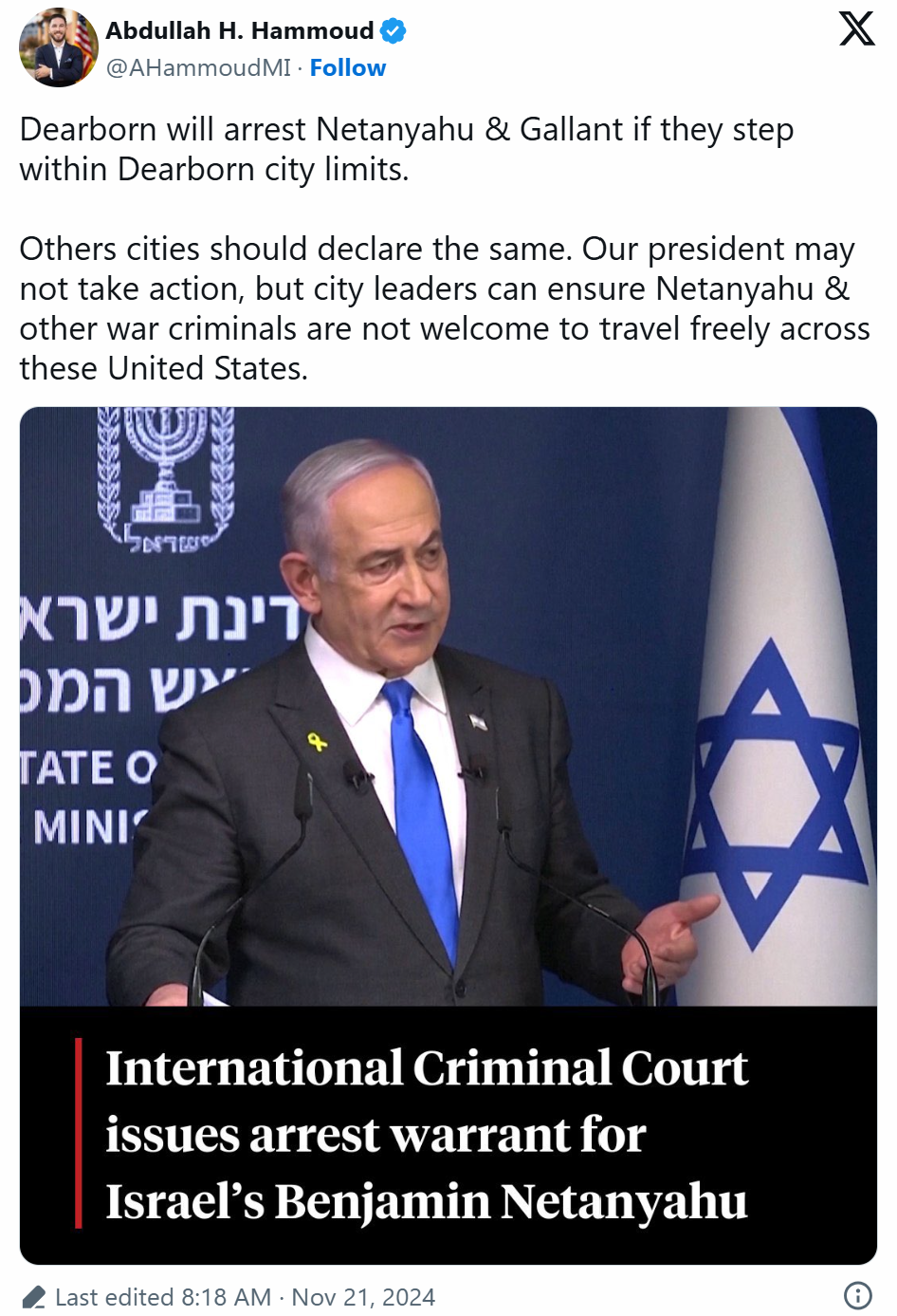 Dearborn, Michigan Mayor Abdullah Hammoud announced on Thursday that Israeli Prime Minister Benjamin Netanyahu and former Defense Minister Yoav Gallant would face arrest if they enter Dearborn, drawing sharp criticism and accusations of grandstanding.