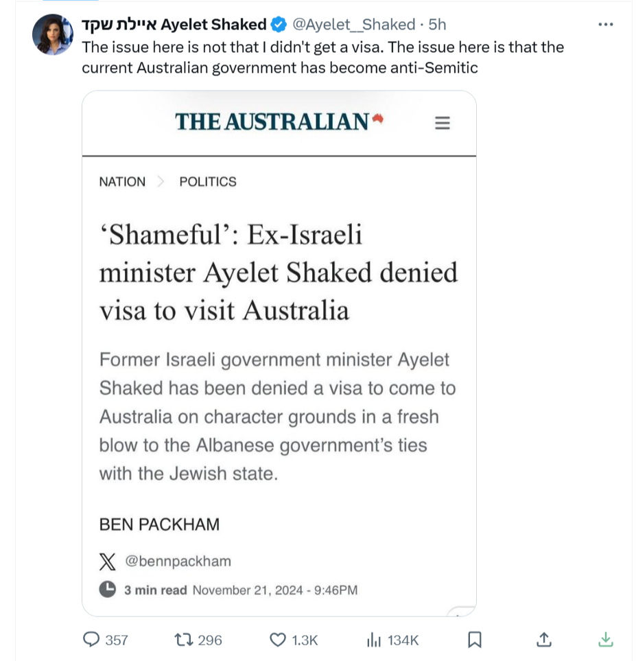 Former minister Ayelet Shaked said on Thursday that Australia denied her a visa to enter the country.